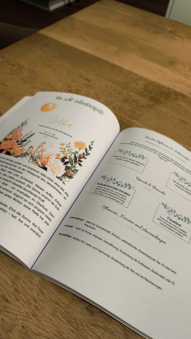 Besondere Schwerpunkte liegen auf weiblicher Selbstfürsorge und Naturspiritualität und einem achtsamen, zyklischen Lebensstil. Die Jahreskreisfeste laden dich ein, Übergänge bewusst zu gestalten, Dankbarkeit zu kultivieren und dich immer wieder neu auszurichten. Dieses Journal ist dein sicherer Raum für Reflexion, Heilung, Wachstum und innere Balance.